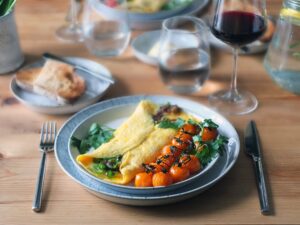 A light-bodied option like Pinot Noir or Beaujolais could work well if you prefer red wine. These wines will add subtle fruitiness and earthy undertones that won’t overpower the delicate flavours of the omelette.