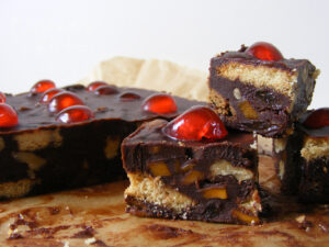 Splendid flavours, splendid entry Elizabeth. For all the amazing bakes I’ve made over the years, tiffin or refrigerator cake is still the one I find it hardest to resist. I try not to make it too often as it is very moreish, but as it must be at least a year since I made it, I think I’m due another bash. I’ve not made this one before, because I’ve always been a bit dubious about adding raw egg, but I guess it gets pasteurised by the warm chocolate mixture, so maybe I should just give it a go. Yours looks absolutely delightful, especially with the cheeky cherries perched on top.