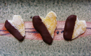 This recipe is adapted from David Lebovitz: Living the Sweet Life in Paris. I scaled down the quantities and dipped some of the crystallized ginger in melted dark chocolate as a little Valentine’s sweet for my sweethearts.
