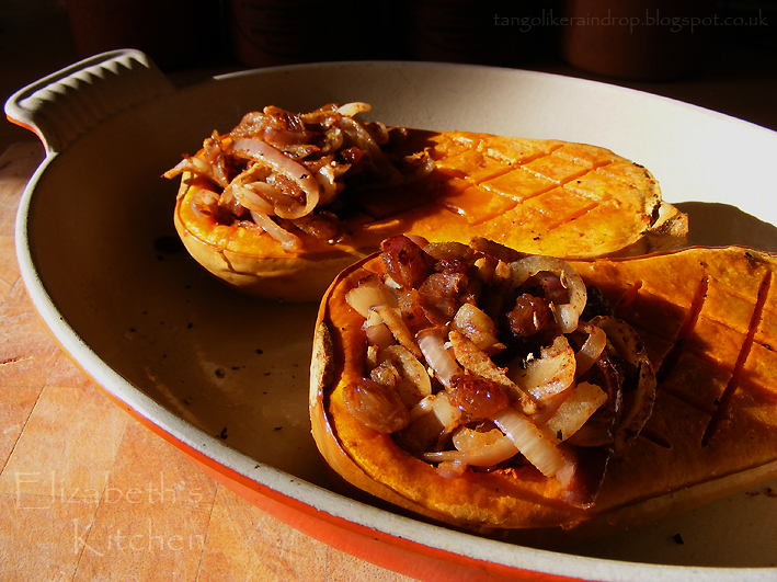 I am a massive fan of buttery caramelized onions. To me they are the ultimate comfort food. I love them with bangers & mash and plenty of gravy, or stirred into cooked quinoa with a liberal grating of Parmesan cheese or like this, served in the centre of a juicy, tender, roasted butternut squash.