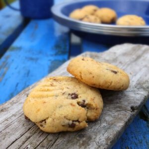 In preparation for our camping trip the eldest made these gorgeous peanut butter chocolate chunk cookies. Some of them even made it on the camping trip (well, seven of them, which, considering how good they were – I had to taste test a few of them while they were still warm, their delicious peanut base studded with oozing molten dark chocolate. Mmmm….