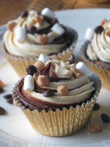 These SKIPPY® Peanut Butter and chocolate swirl cupcakes were inspired by my own childhood love of peanut butter and chocolate. As a child growing up in Canada, we used to make s’mores using peanut butter, chocolate chips, graham crackers and marshmallows, and that flavour, to me, is the most nostalgic way to eat peanut butter.