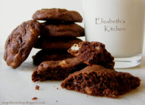There’s a fabulous double death by chocolate cookie recipe in The Great British Bake Off: How to Turn Everyday Bakes into Showstoppers cookery book (an Xmas gift from my children) and this is how I adapted it to use up what I had.