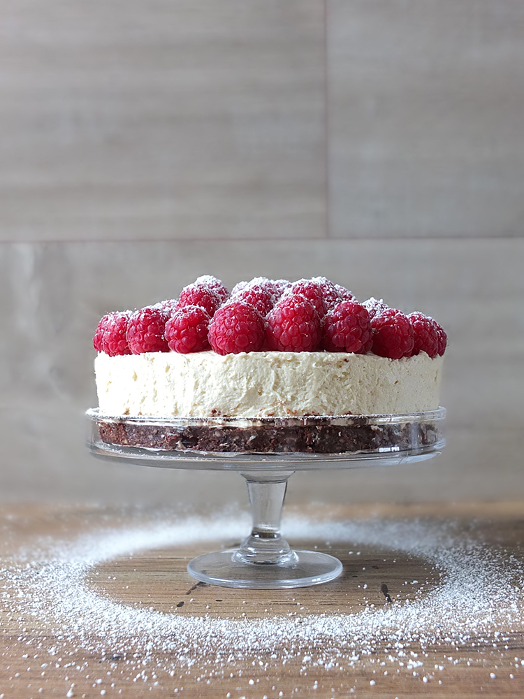 The first time I made this recipe I used honey in the base, which is made up of whizzed up nuts, cocoa and raw cacao nibs stuck together with some melted butter. The base came out rather fudgy chewy, which was rather nice, I thought, but I wanted something a bit more crumbly and crunchy like a regular cheesecake base, so I replaced the honey with dark muscovado sugar, the cocoa powder with raw cacao and the butter with coconut oil. Perfection!