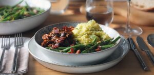 - Garnish the vegan mushroom bourguignon with 100 grams vegan bacon, fried until crispy, fresh parsley and sliced spring onions. Serve with creamy mashed potatoes and green beans almondine.