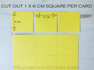 Cut out one 6 cm square for each card. Cut out one 6.0 x 7.0 cm rectangle for each card too (not pictured).