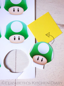 Cut out each of the 1UP mushrooms leaving a 1 cm white piece on the bottom. Glue to the 6 cm square yellow craft card and cut out.