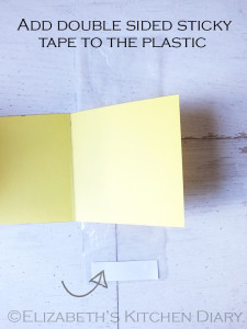 Add a piece of double sided sticky tape to the bottom edge of the plastic. Line up the plastic under the first square section of the yellow craft card you cut out earlier.