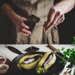 Using a vegetable peeler, peel the skin off each of the 3 medium aubergines so they have stripes. Sprinkle generously with 2 tbsp Shetland sea salt and leave for 20 minutes for the liquid to come out.